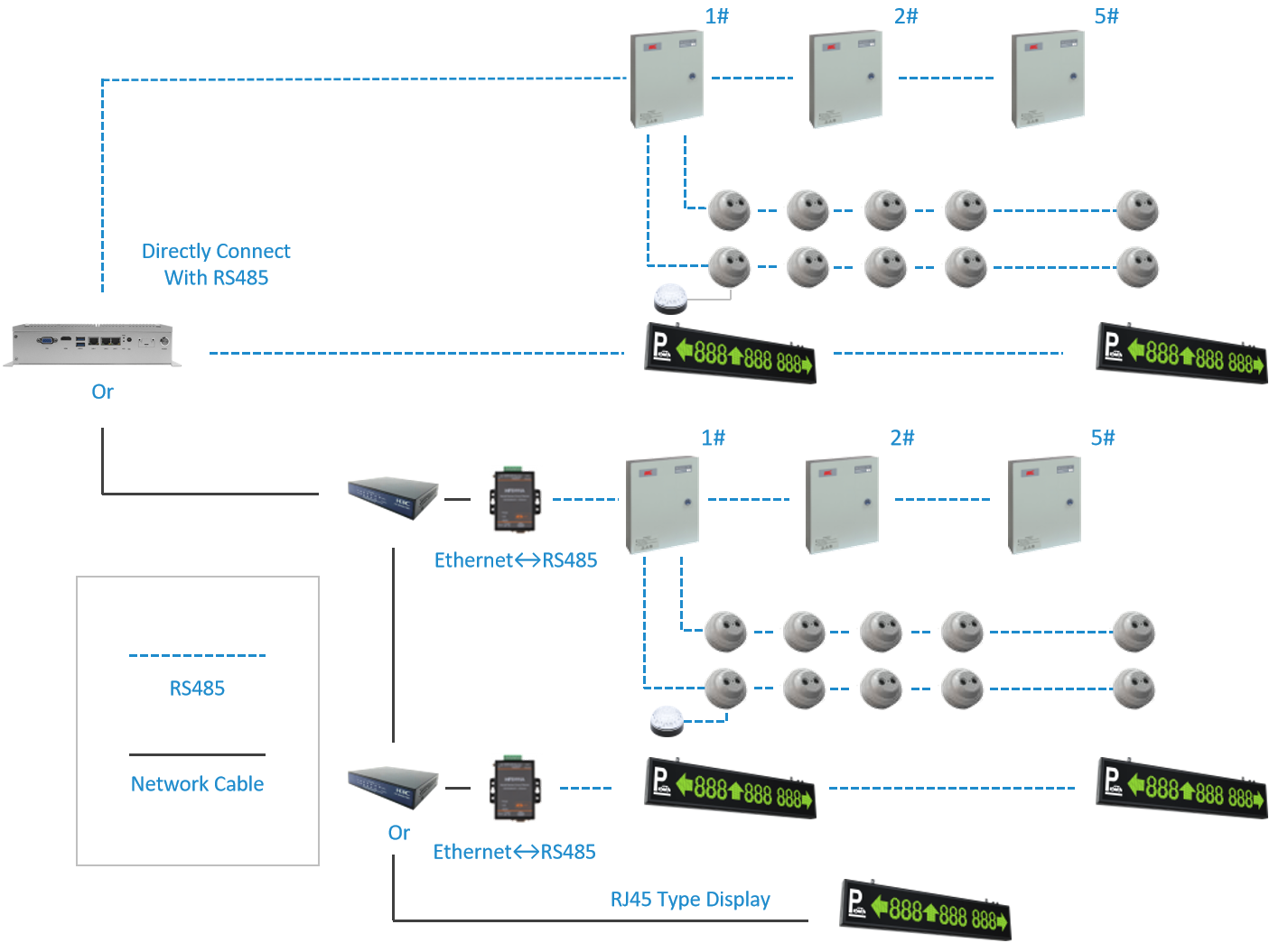 Zonal controller processes data acquired form ultrasonic sensor, update real-time information to the system and associated signage, reports to upper layer on RS485 Bus.